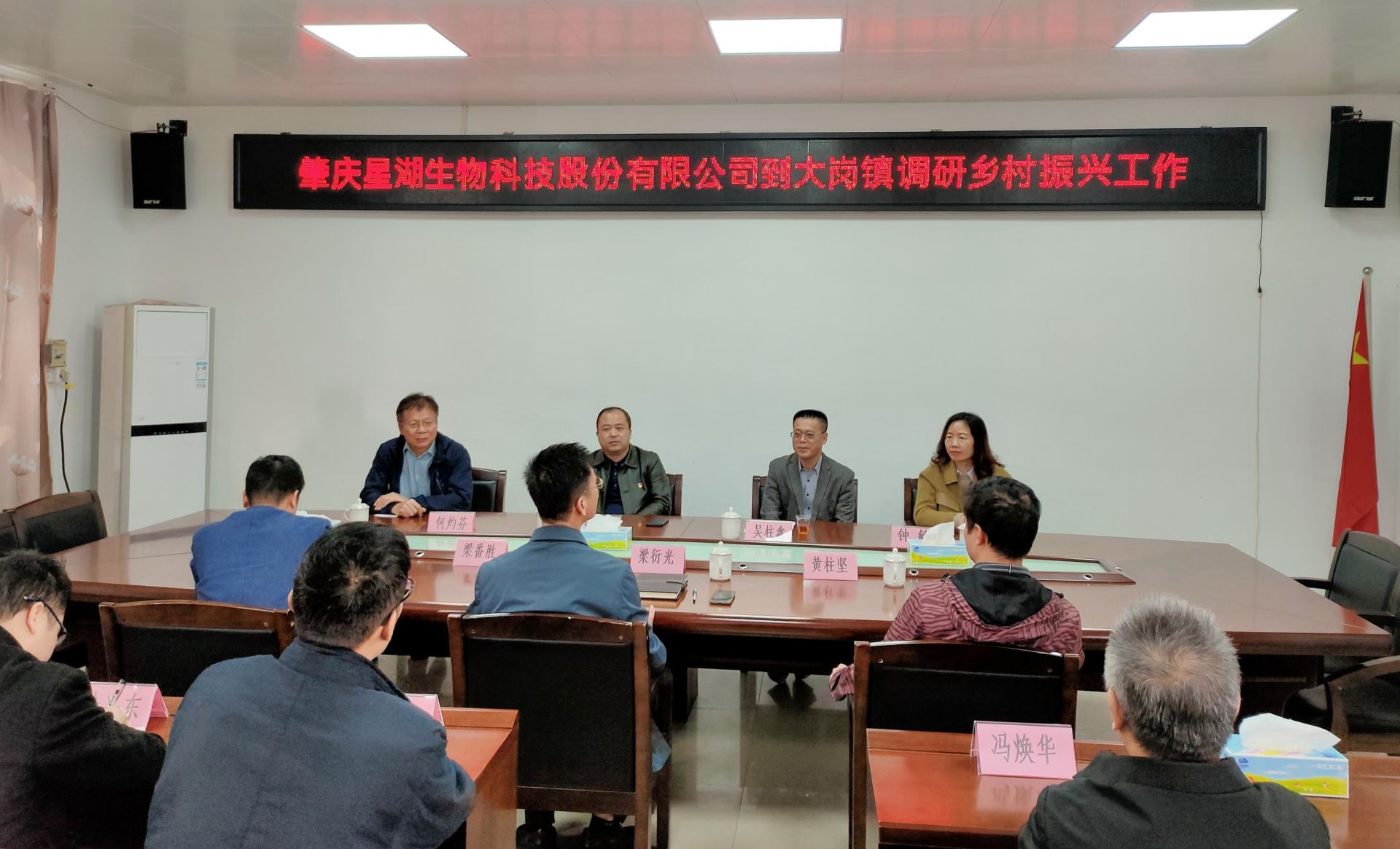 调研组深入工作队办公室了解工作队办公环境,查阅乡村振兴资料,询问防止返贫监测户帮扶情况,召开乡村振兴工作座谈会,会上,大岗镇党委书记梁衍光详细介绍了大岗镇基本情况及乡村振兴工作进展情况、存在困难以及工作思路,表示将在星湖科技等帮扶单位的指导下,以“大业凭拼力、岗峰勇登攀”的大岗精神推进大岗镇乡村振兴。应军代表公司党委作了发言,对大岗镇乡村振兴发展思路表示认可,对工作队进驻以来的工作给予了肯定。表示公司将按照上级党委的决策部署,认真履行国企社会责任,协助大岗镇推进乡村振兴工作,为建设美丽大岗作出积极贡献,并希望工作队在大岗镇党委政府的领导下持续用力,确保帮扶工作出实效。