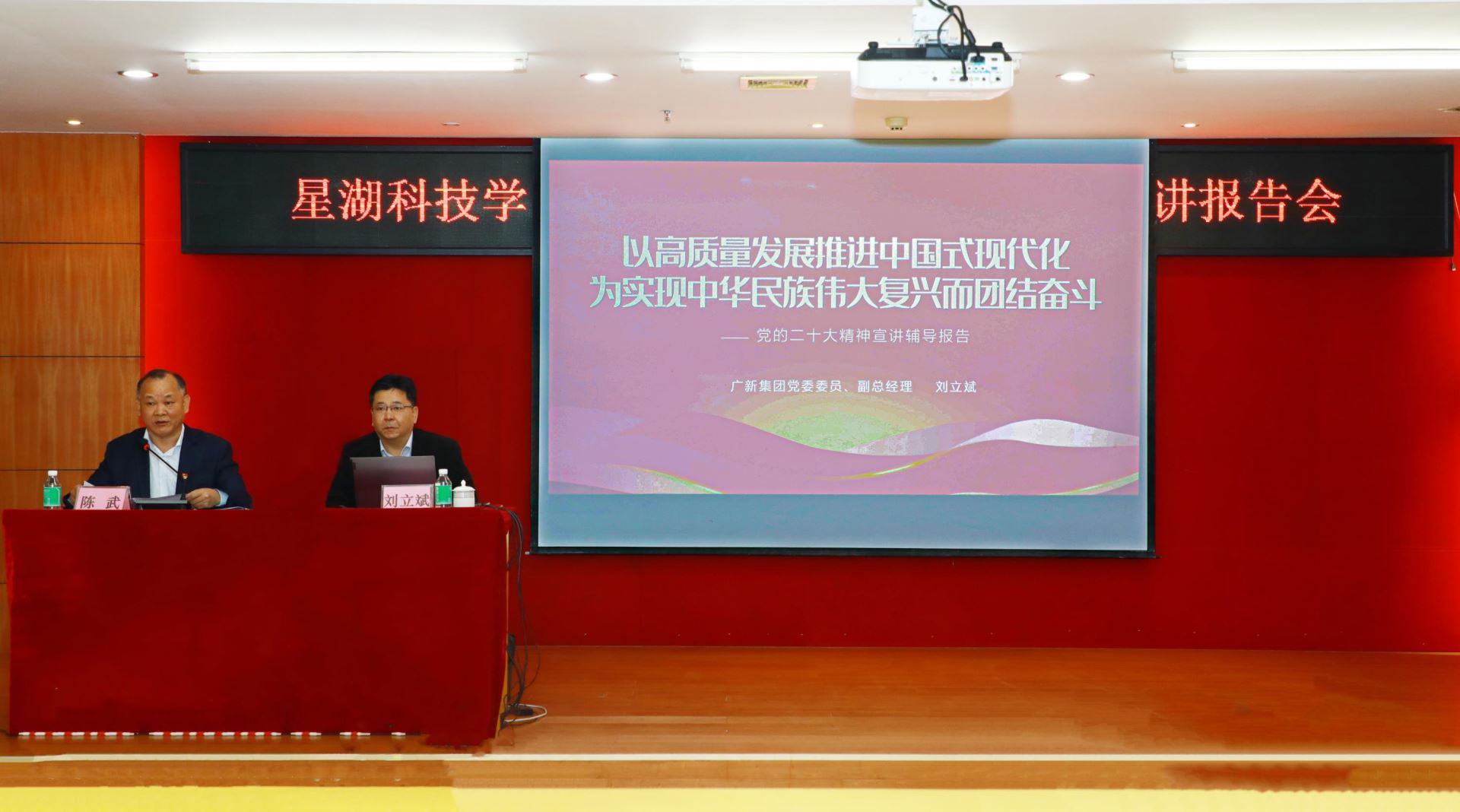 为深入学习宣传贯彻党的二十大精神,12月8日上午,广新集团党委委员、副总经理刘立斌到星湖科技作题为《以高质量发展推进中国式现代化 为实现中华民族伟大复兴而团结奋斗》的宣讲报告。星湖科技党委书记、董事长陈武主持会议。