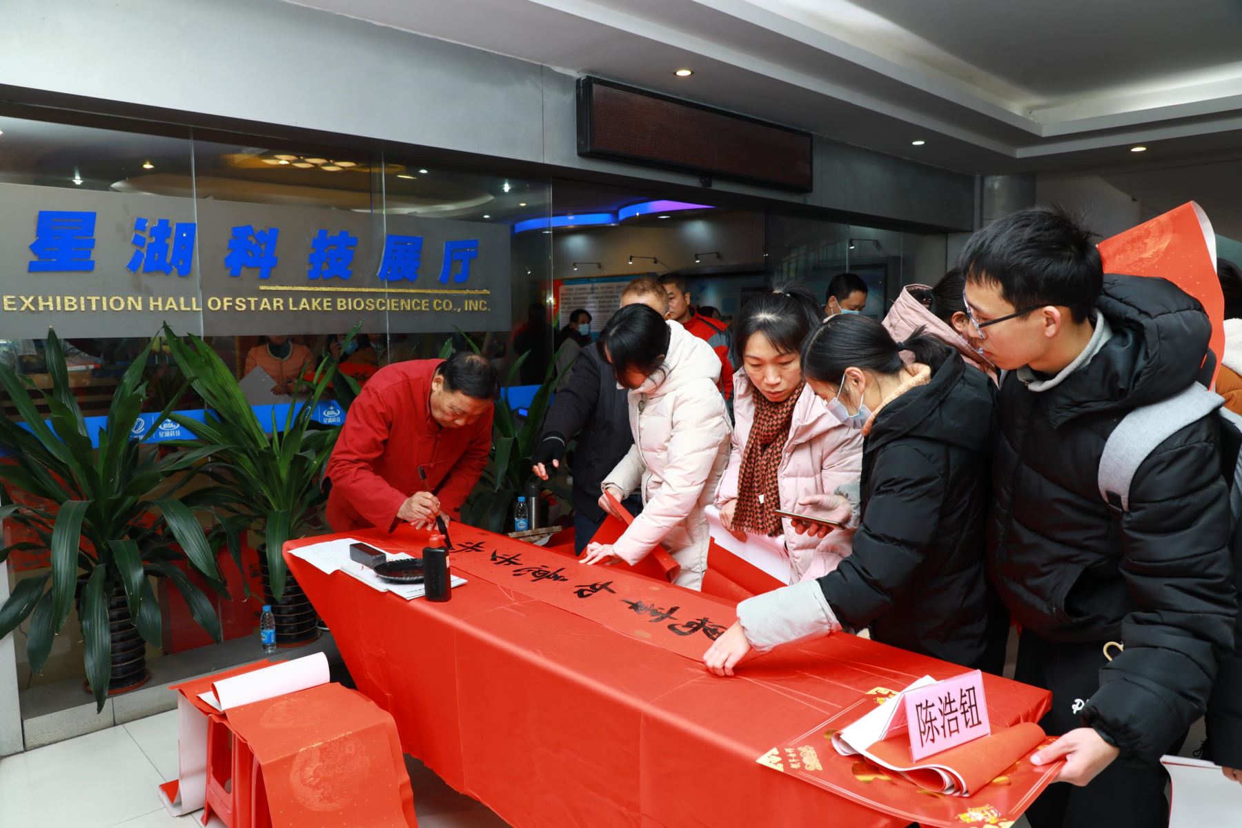 在生物工程基地办公大楼前,精心布置的场地、高高挂起的灯笼,让活动现场暖意融融、喜气洋洋。尽管活动当天气温寒冷,但书法家、志愿者和广大员工依然准时抵达现场,一片欢乐祥和景象。