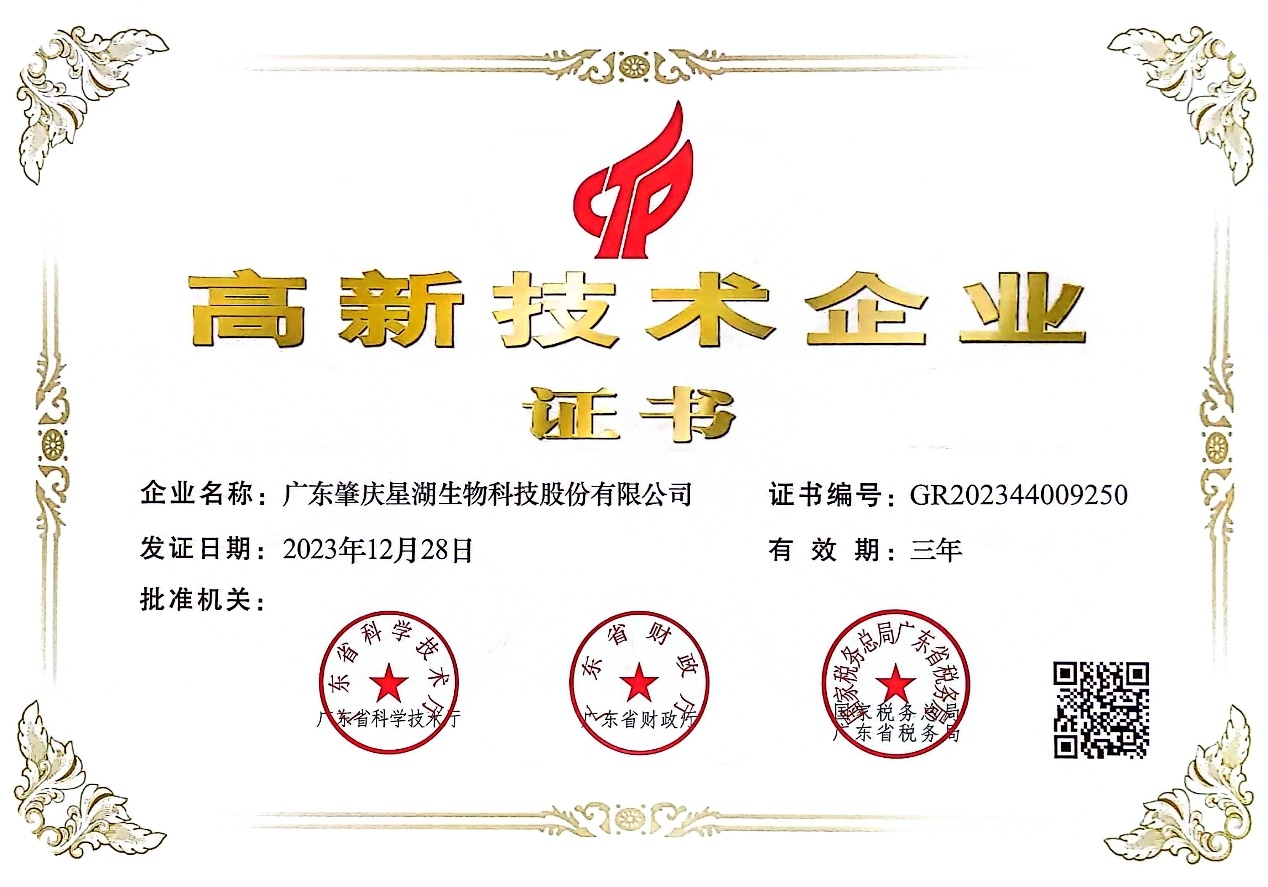 近日,星湖科技收到由广东省科学技术厅、广东省财政厅、国家税务总局广东省税务局联合颁发的高新技术企业证书,星湖科技顺利通过高新技术企业重新认定,这是对公司技术创新能力的充分认可。